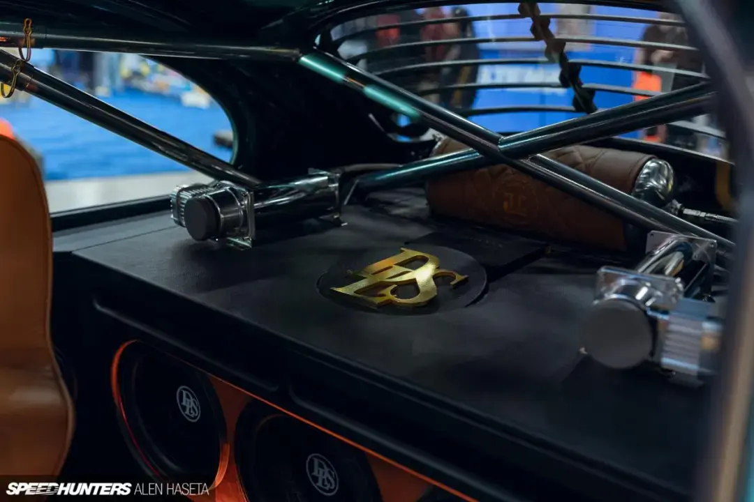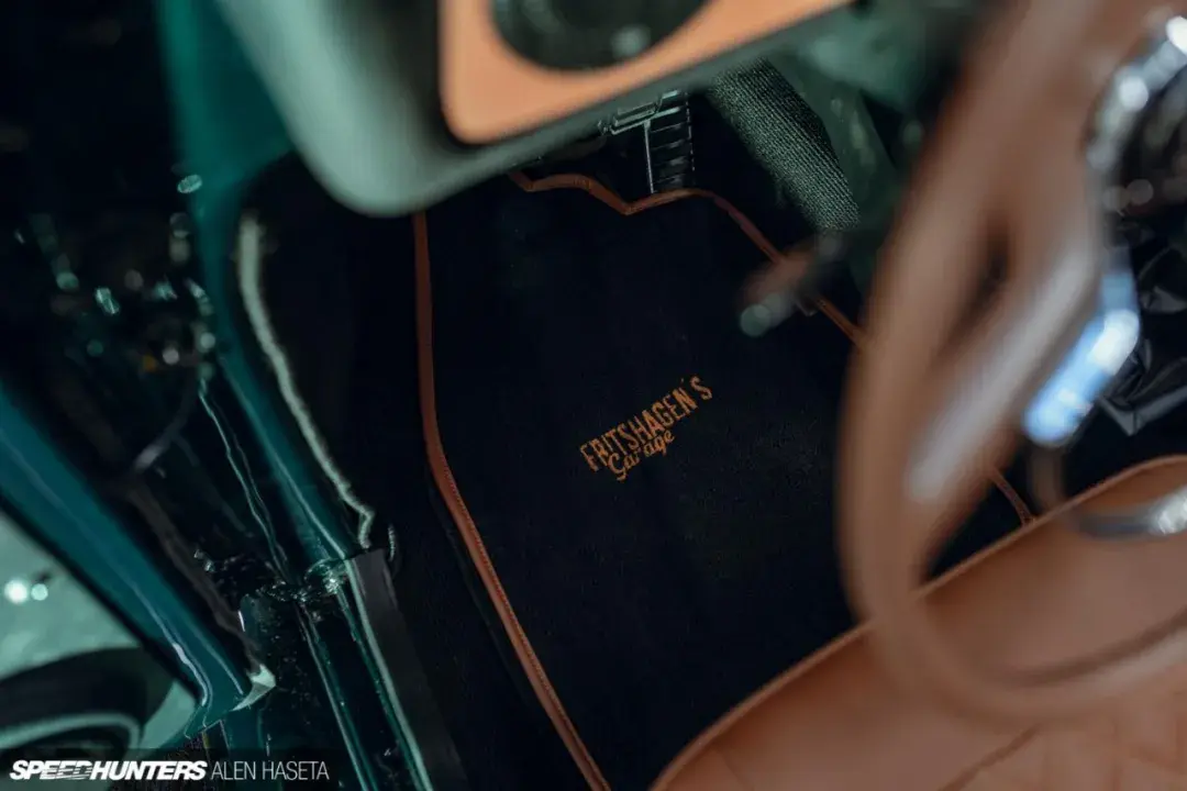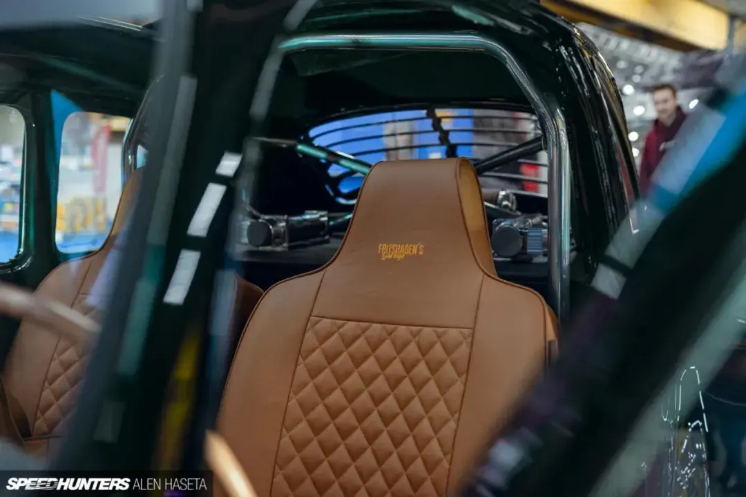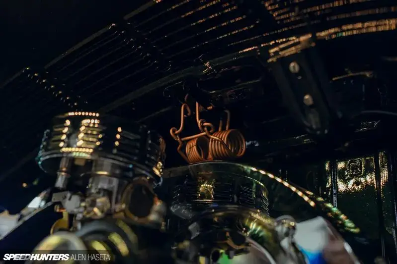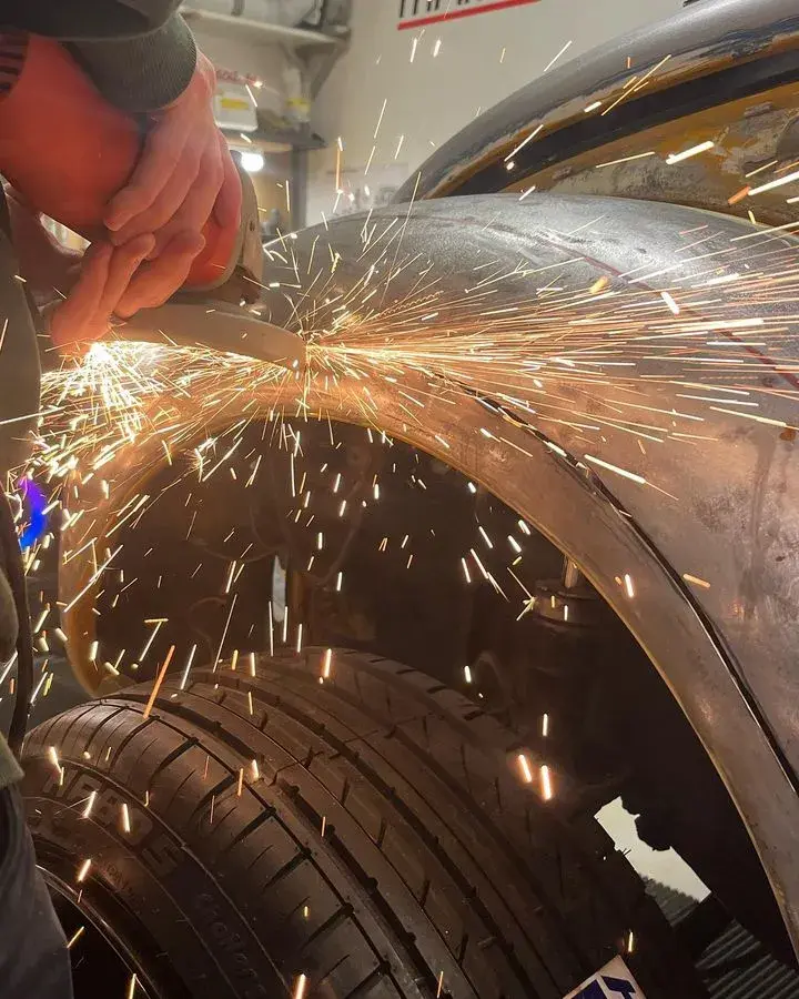 為了達(dá)到與寬體翼子板齊平的效果,還手工焊接加寬了輪轂。數(shù)據(jù)達(dá)到了前17寸10J,17寸13J,而且是復(fù)古的輻條輪轂。