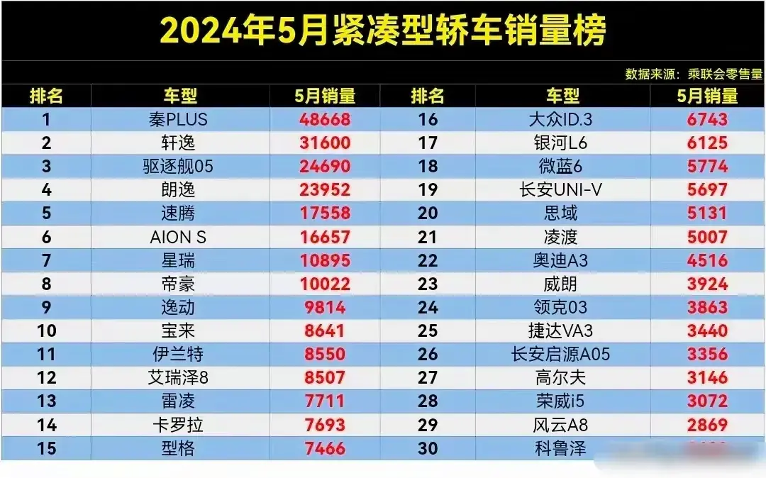 風水輪流轉,在這場新能源與燃油車的角逐賽中,我國自主品牌通過不斷的技術攻關,在新能源汽車領域已實現彎道超車,合資燃油車曾經的霸主地位已然不保。根據乘聯會發布的2024年5月緊湊型轎車銷量榜來看,銷量突破1萬輛大關的車型共有8款,新能源車型秦PLUS以絕對的優勢登頂榜首,繼續蟬聯冠軍。曾經風光無限的燃油車銷冠王軒逸這次痛失冠軍,退居二線,獲得亞軍。驅逐艦05表現也很不錯,獲得季軍。朗逸和速騰都進入前五名。逸動、寶來、帝豪、星瑞、AION S都進入榜單前十名。太慘了!5月緊湊型轎車銷量榜,軒逸丟冠,朗逸第4名,帝豪第8名