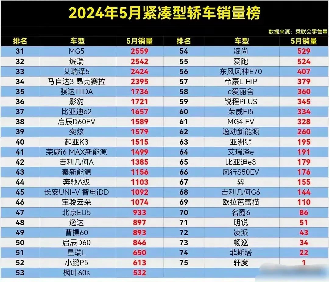31-75排名中,寶駿云朵、奔馳A級、秦新能源、起亞K3、吉利幾何A、奕炫、啟辰D60EV、比亞迪e2、影豹、馬自達3 昂克賽拉、艾瑞澤5、繽瑞、MG5表現還可以,都在1千-2千多輛。北京EU5、逸達、小鵬P5、星瑞L、曹操60、楓葉60s、愛跑、凌尚、表現都一般,銷量都在5百-9百多輛。東風風神E70、a愛麗舍、瑞程PLUS、MG4 EV、榮威Ei5、亞洲獅、逸動新能源、艾瑞澤e、比亞迪e3、吉利幾何G6、名爵6、凌派等表現都不佳,銷量都在500輛以下,還需多努力才行。