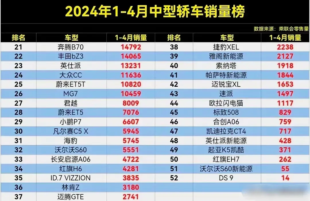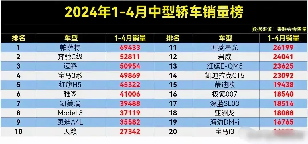 B級(jí)車市場(chǎng)一直都是車企必爭(zhēng)之地,素來(lái)就有“得B級(jí)車者得天下”之說(shuō)。群雄逐鹿,誰(shuí)才能雄霸一方呢?我們來(lái)看一下,乘聯(lián)會(huì)公布的2024年1-4月中型轎車銷量排行榜,從數(shù)據(jù)中可以得知,銷量突破4萬(wàn)輛的車型共有6款,德系車表現(xiàn)強(qiáng)勢(shì),獨(dú)占前三甲,帕薩特登頂榜首,奪得冠軍,奔馳C級(jí)表現(xiàn)也不錯(cuò),獲得亞軍,邁騰緊跟其后,成為季軍,寶馬3系和紅旗H5都進(jìn)入前五,雅閣、Model 3、奧迪A4L、天籟、凱美瑞都進(jìn)入榜單前十名。太慘了!1-4月中型轎車銷量榜,帕薩特奪冠,凱美瑞第7,天籟第10
