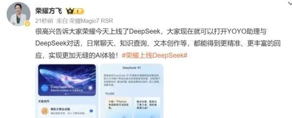 榮耀官方宣布了這個令人興奮的消息:DeepSeek大模型正式接入YOYO智能體! 據(jù)悉,榮耀終端公司CEO方飛親自參與了這個項目的推進。這可不是普通的系統(tǒng)升級,而是基于DeepSeek-R1開源大模型的全新體驗,針對榮耀Magic系列手機,并適配YOYO最新版本。 DeepSeek的目標(biāo)是提供沉浸式深度思考體驗,想想就覺得酷炫!這可不是簡單的語音助手升級,而是真正意義上的AI進化! 嵐圖汽車、極氪、東風(fēng)猛士都已嘗鮮DeepSeek,但榮耀手機率先在移動領(lǐng)域應(yīng)用,這步棋走得漂亮!