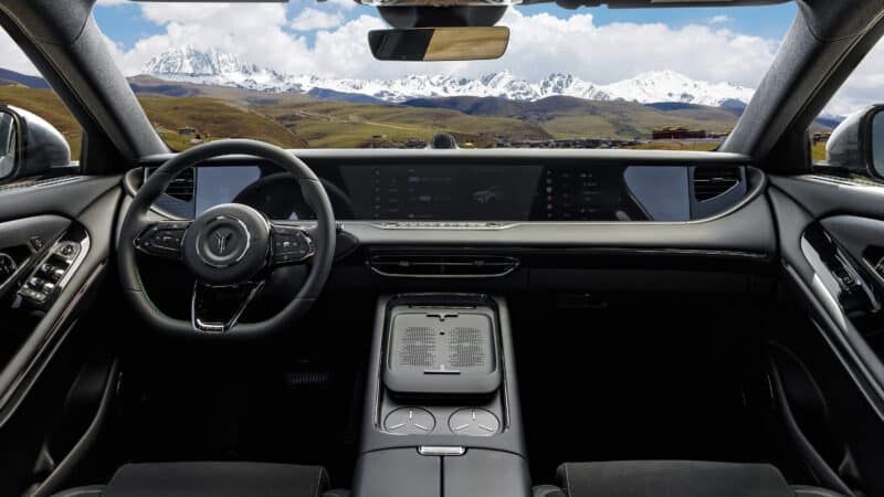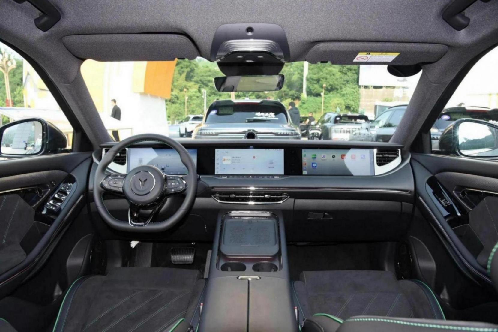 嵐圖FREE 318 的內部結構也與 超長續航智駕版車型相似。它的中控臺有一個由三個獨立屏幕組成的大聯屏,還有一個 D 形三輻方向盤,轉向柱上還安裝有變速桿。 中控臺扶手還兩個無線手機充電板和兩個杯架。