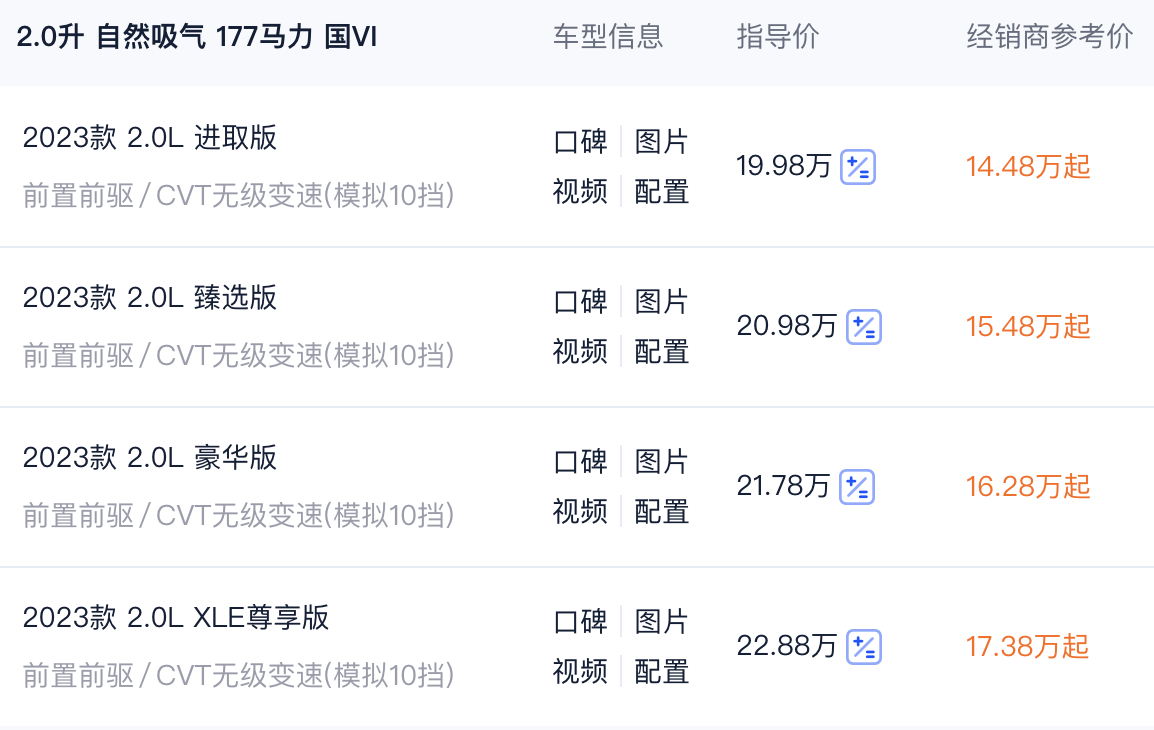 于是豐田也“低下了高傲的頭顱”,在終端啟動了降價,我們從汽車門戶網站得到的報價數據顯示,這款售價19.98-27.98萬元的中型轎車產品,目前有超過5萬元的終端優惠,起售價來到了14.5萬左右,當然這是國內最低報價,不代表所有門店都有這樣的優惠幅度,希望大家知曉。對于一款4.99米,已經夠得上中大型轎車尺寸的合資中型車產品來說,這樣的價格可以說很“卑微”了。