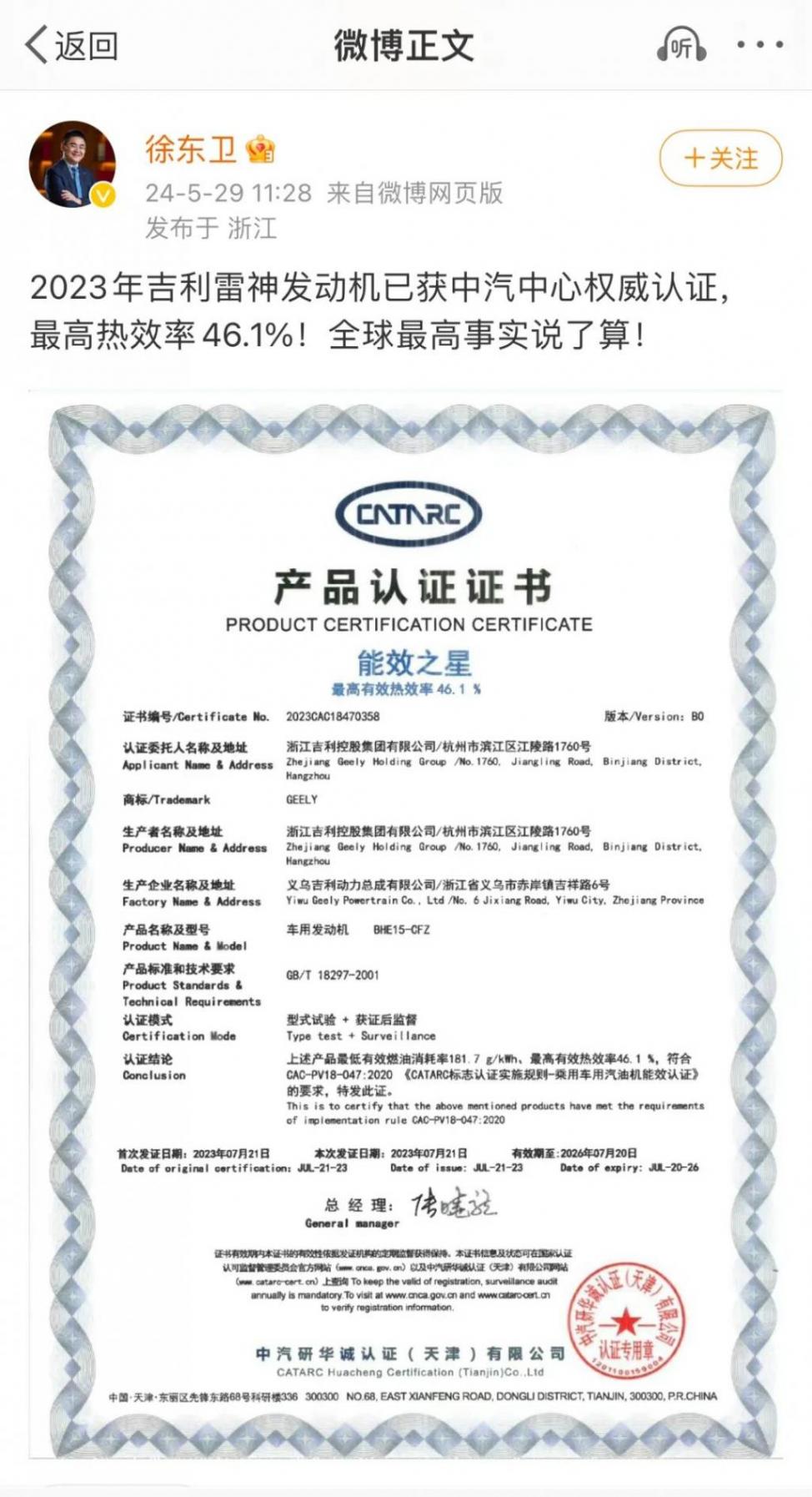 吉利汽車高管徐衛東在29日中午,發布了一條關于吉利雷神發動機已經在2023年拿下46.1%最高熱效率認證,并且喊出了“全球最高事實說了算”的口號,而且還號召媒體和KOL轉發,我的朋友圈可熱鬧了……