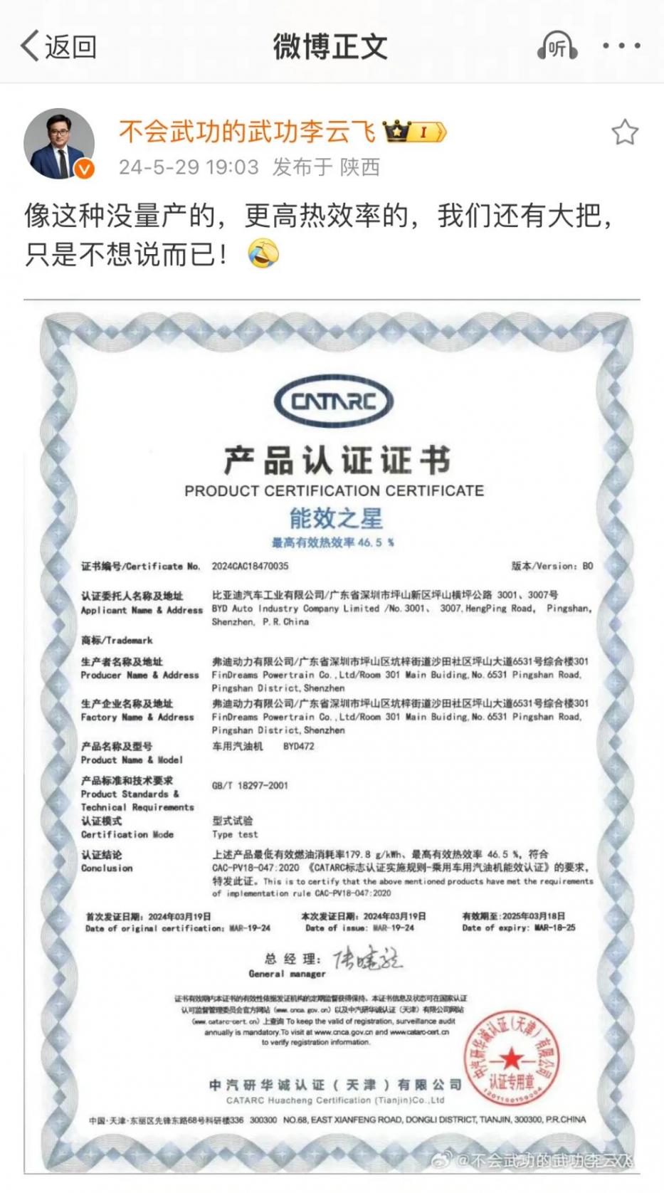 要說李云飛也真是耐得住性子,話只說了一半,到了晚上7點,也就是“迪粉”大會開始的時候,這位老哥在社交平臺上傳了一張同樣是中汽中心出具,熱效率達到46.5%的比亞迪某款發動機的熱效率認證,并且“輕描淡寫”配文:像這種沒有量產的,更高熱效率,我們還有一大把,只是不想說而已。還配了一個捂臉苦笑的表情包,給人的感覺就是,這種王者戰青銅的戰局,好沒意思!順便還預告了一下“后招”,我們可以有熱效率46.5%的發動機技術儲備哦!