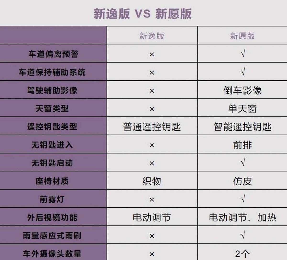 兩款車的價(jià)格相差8000元,新愿版的配置要豐富一些,比新逸版多了車道偏離預(yù)警、車道保持輔助系統(tǒng)、倒車影像、無(wú)鑰匙進(jìn)入和啟動(dòng)等。