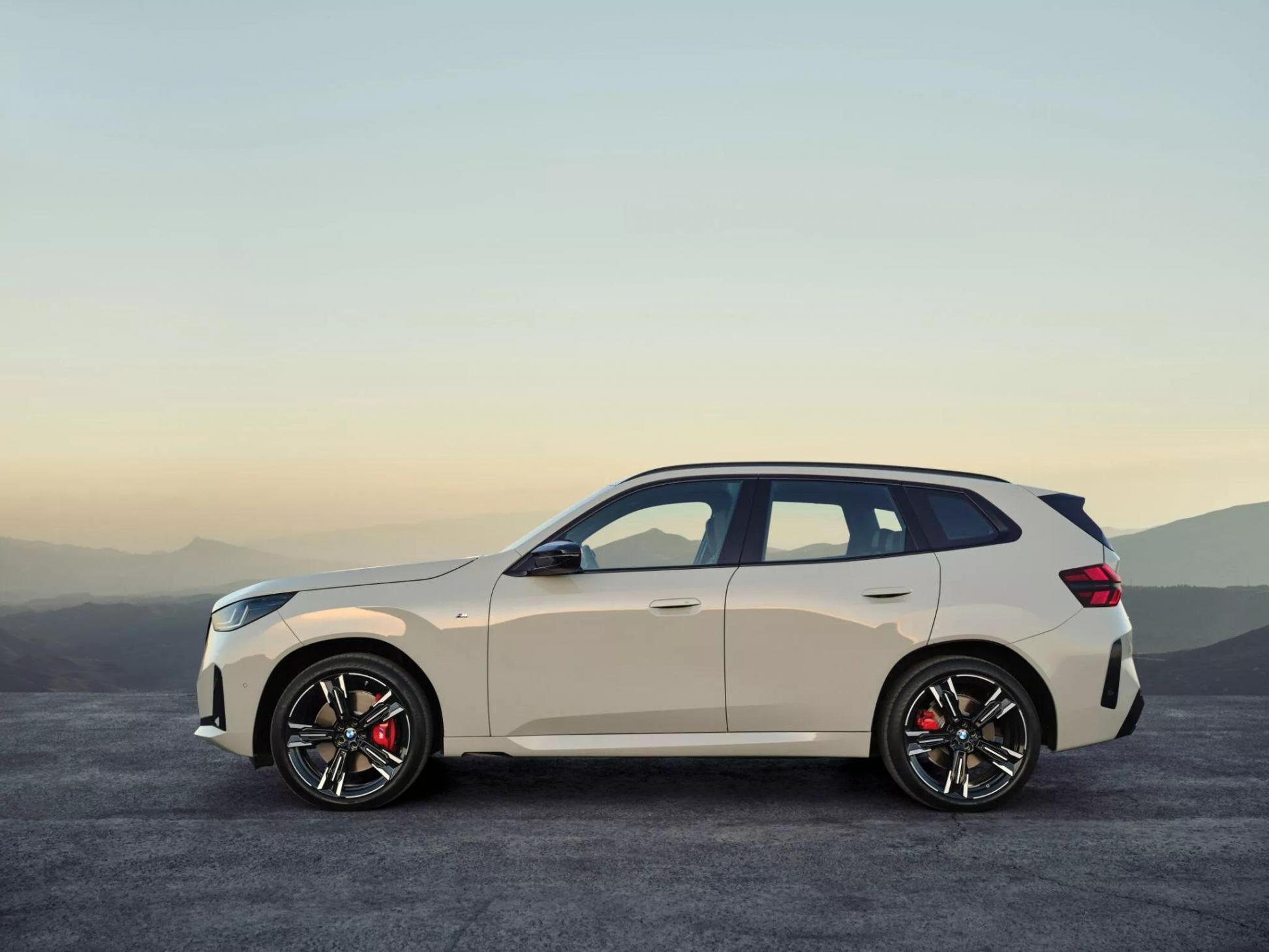 在車身的側面,全新一代的寶馬X3采用的是非常干練的設計,新車的形象大變樣,設計風格和寶馬XM有些類似。新車采用的是下沉式的車頂設計,D柱采用前傾式的風格打造,它的車窗的底部以及D柱的前側有鍍鉻條的裝飾,新車的車身的側面采用的是上揚式的腰線裝飾,車的底部采用的是極簡化的包圍。全新一代的寶馬X3 M50 xDrive的車窗的周圍采用的是黑色的裝飾條點綴,它的車輪更大,表現得更加兇悍一些。