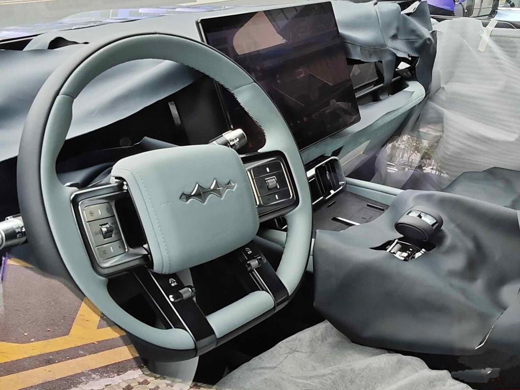 在內飾方面,我們可以看到方程豹豹8的中控臺采用的是非常粗獷的設計,新車的硬派效果十分的明顯,它采用的是懸浮效果的大屏,采用的是三幅平底的方向盤,方向盤采用了家族化的樣式。新車的中控臺上采用的是階梯效果的面板裝飾,前側貌似配備了HUD,它的電子檔桿的造型也比較方正,展現出了硬派化的一面。作為一款大塊頭的車型,豹8的空間表現也很出色,第二排有很好的腿部空間。
