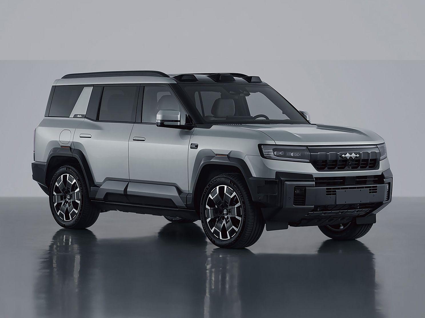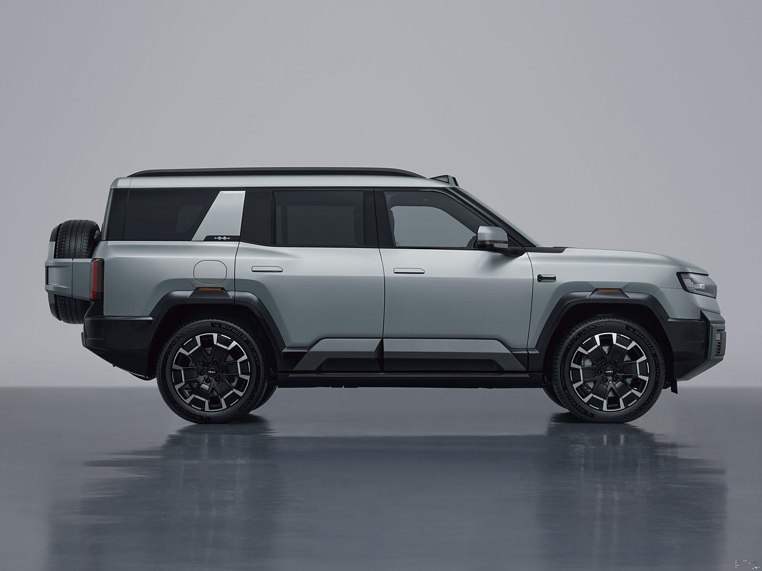 在車身的側面,新車也采用非常硬派化的設計,采用懸浮效果的車頂設計,它的C柱采用獠牙式的風格打造,D柱采用隱藏式的設計,A柱也進行了隱藏。新車的后翼子板的位置很突出,前后采用的是突出的輪拱,車底部同樣采用硬派的包圍。新車的前側的額頭上配備有激光雷達,并且有平整的車頂,它的整體效果還是很不錯的。