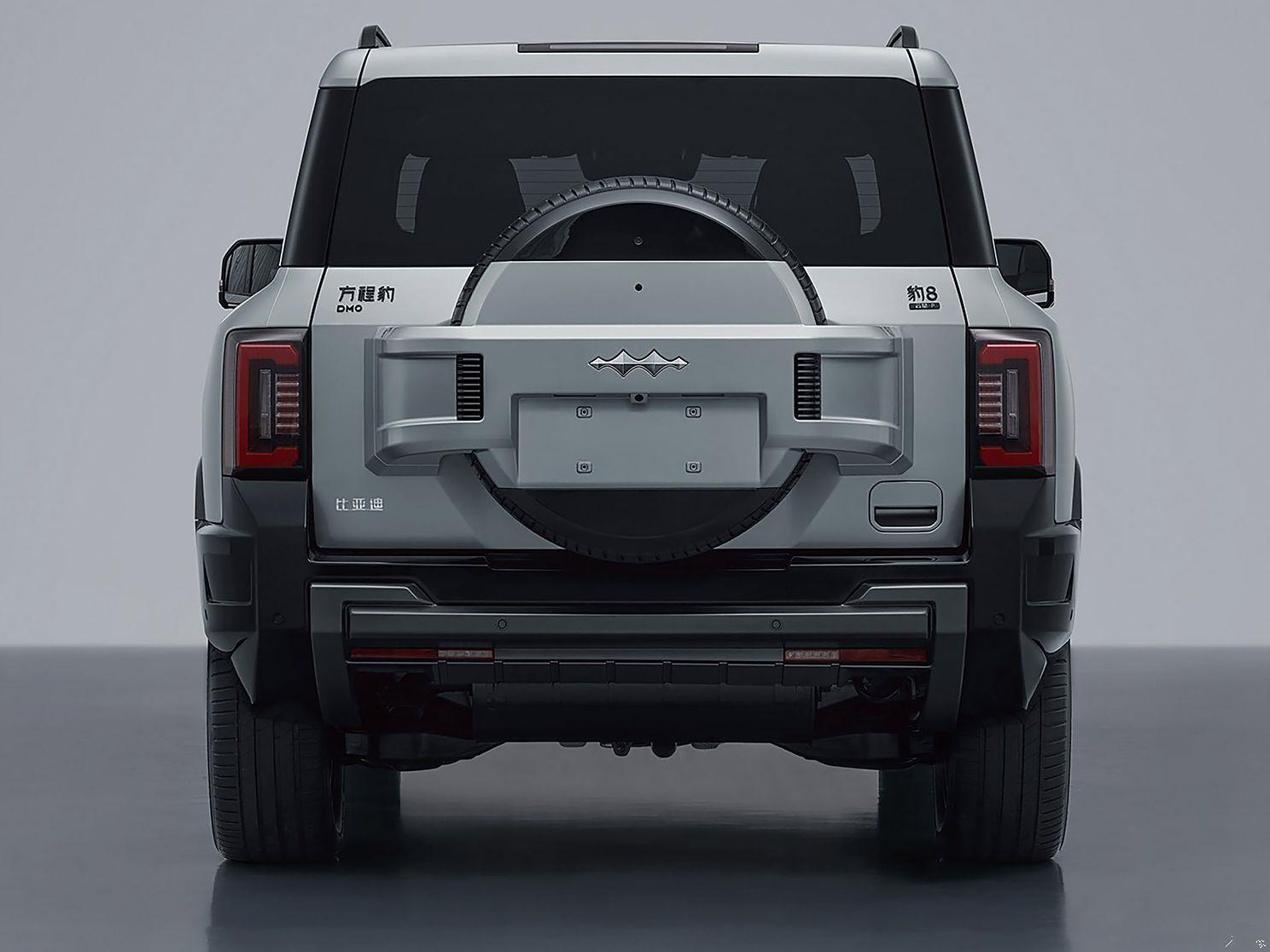 在車的尾部,新車表現出了較為硬派化的一面,它采用的是略前傾的后擋風玻璃,新車的后擋風玻璃占比面積并不算很大。車身的下半部分相對而言要突出一些,并且采用的是外掛備胎,它還有個性的備胎蓋,只不過這樣不容易將備胎卸下來。新車的尾燈采用的是方形設計,尾燈的輪廓很突出,車的底部還有粗獷的包圍,它的離去角也很大。在動力方面,方程豹豹8搭載的是2.0T發動機+前200kW/后300kW電機的組合,發動機最大輸出272馬力,可見它的動力有多強悍。
