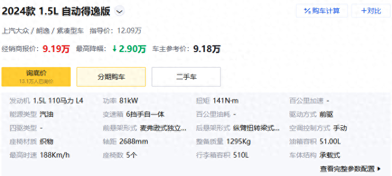價(jià)格是大多數(shù)消費(fèi)者買車需要考慮到的事情,在這方面,2024款大眾朗逸的起售價(jià)為12.09萬(wàn)元,但是目前在終端方面,它還有著2.9萬(wàn)元的購(gòu)車優(yōu)惠,其優(yōu)惠之后的價(jià)格僅為9.19萬(wàn)元。顯然這個(gè)價(jià)格還是比較有誠(chéng)意的。