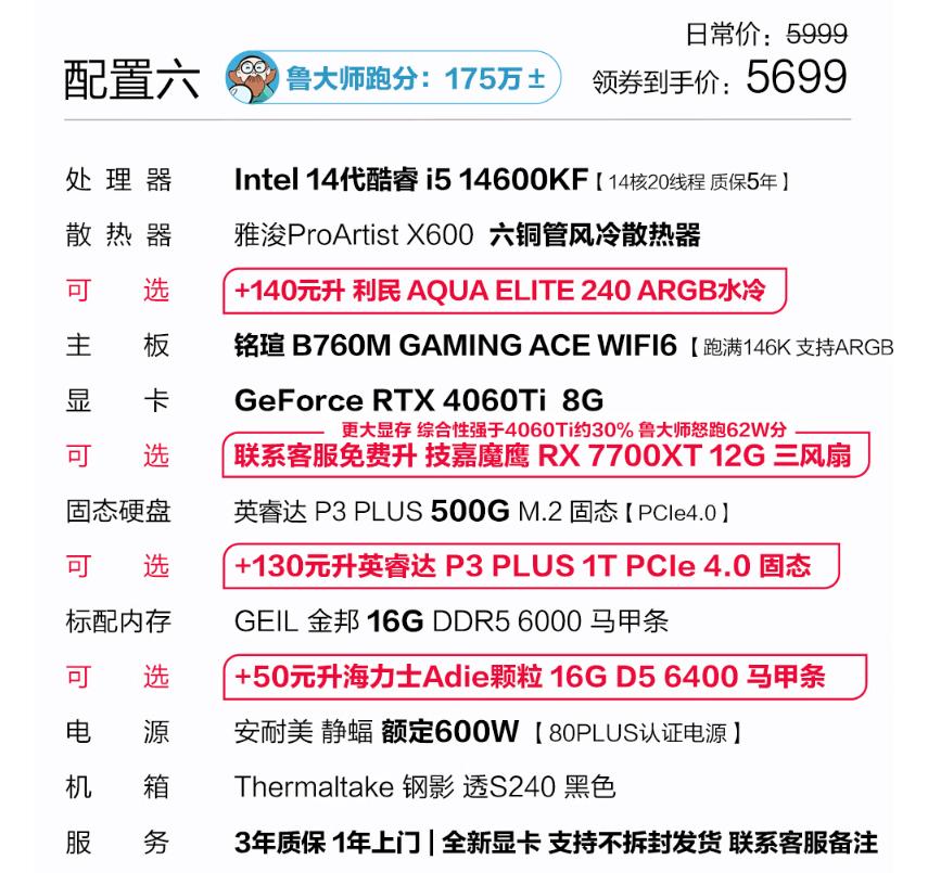 電源是600W,采用了雅浚六銅管風(fēng)冷散熱,加140元升級到240水冷。提供3年質(zhì)保。