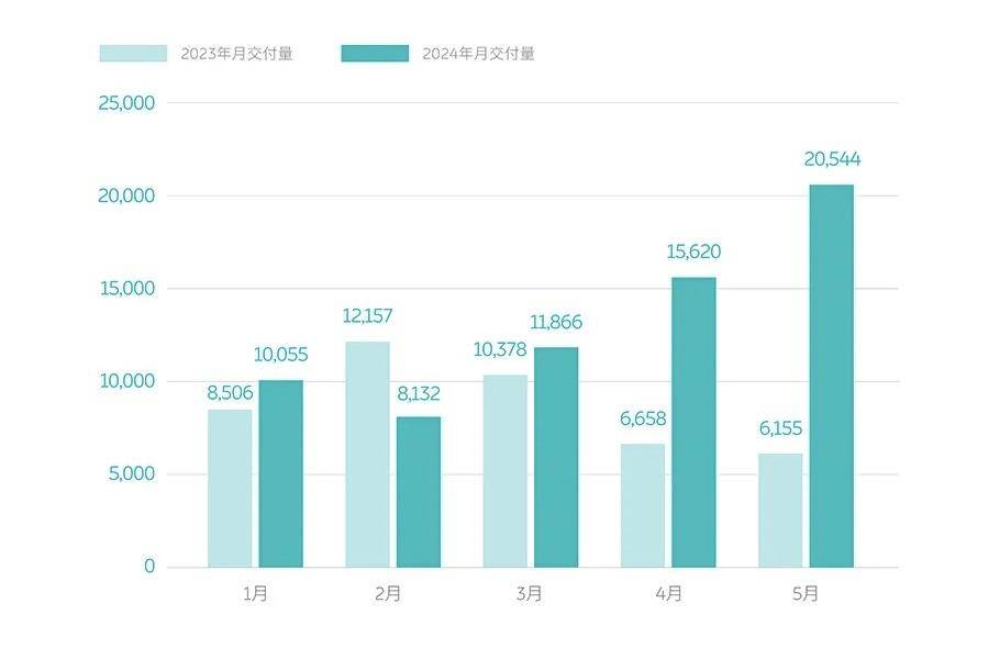 蔚來銷量創(chuàng)新高,5月份共交付20544輛新車,同比增長233.8%,環(huán)比增長31.5%。