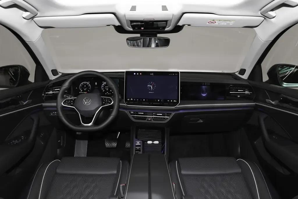 邁騰 B9 的內飾則更具科技感。三聯屏設計,包括大尺寸中控觸摸屏和副駕駛娛樂屏,提升了車內的科技氛圍。換擋機構改為懷擋設計,中控區域更加簡潔。內飾材質也進行了升級,大量軟質皮革的使用讓車內質感大幅提升,細節處理非常精致,整體氛圍更顯豪華。