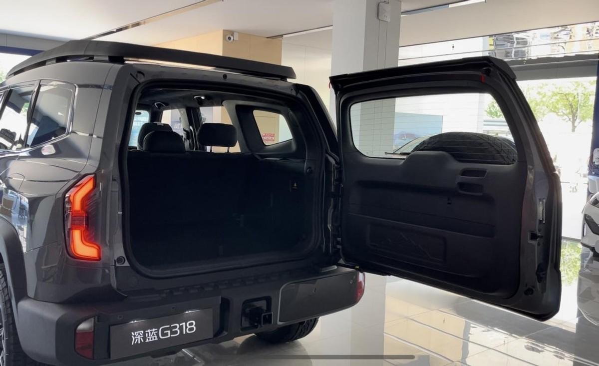 深藍(lán)G318在尾部也采用小書包的設(shè)計(jì),它并沒有套輪胎外殼,所以尾部看上去更有一種越野老炮的氣質(zhì)。在輪胎的下方,它原廠自帶拖拽口,擁有1.6噸的拖拽資質(zhì),拉一個(gè)房車或者2個(gè)摩托車沒有問題的,這也省去了用戶后期加裝的煩惱了。