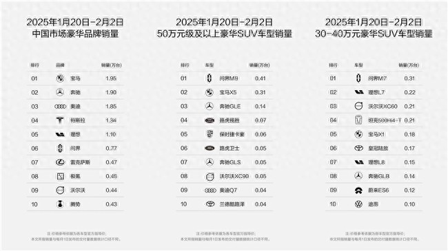 在2025年的第4至5周,問界在中國市場豪華品牌銷量中處于前列,問界M9穩坐50萬元級及以上豪華SUV車型銷量周榜第一,而作為2024年中國新勢力的年度銷冠,問界新M7在今年1月持續保持著30萬級中國新勢力車型的TOP級銷量,其斷層領先的實力有目共睹。