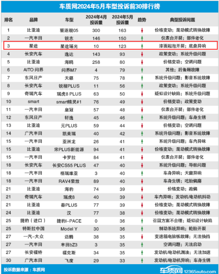 從這個層面來看,2024年5月份,星途瑤光因為該問題遭到較多投訴,而登上車質網發布的5月份車型投訴榜,多少有些“冤”。