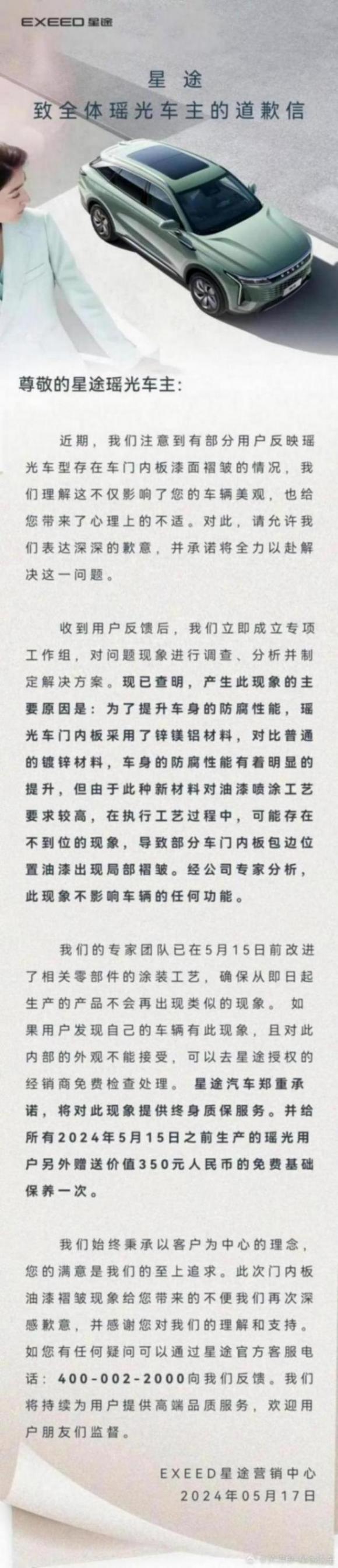事實上,對于星途瑤光存在的“漆面問題”,星途也已經關注到了這個問題給用戶帶來的不便。