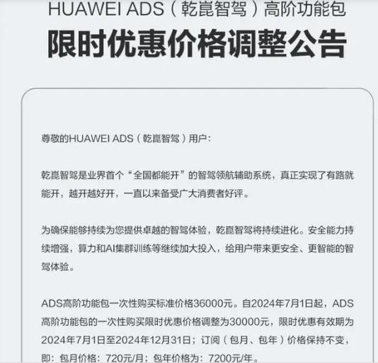 另外,鴻蒙智行宣布對乾崑智駕ADS高階功能包進行價格調整,一次性購買的限時優惠價降至3萬元,較原價優惠6000元。對于要高端智駕的鴻蒙智行潛在買家來說,便宜6000元還是挺香的。