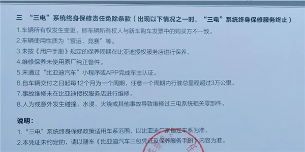 在大多數消費者的印象中,“三電質保”政策是有門檻,對是否首任車主、是否在4S店保養甚至續航里程等都有著較為嚴格的要求,仿佛這個質保只是紙上的一項條款而已。這時候,比亞迪對這條售后的政策改革了,放寬相關的條件。