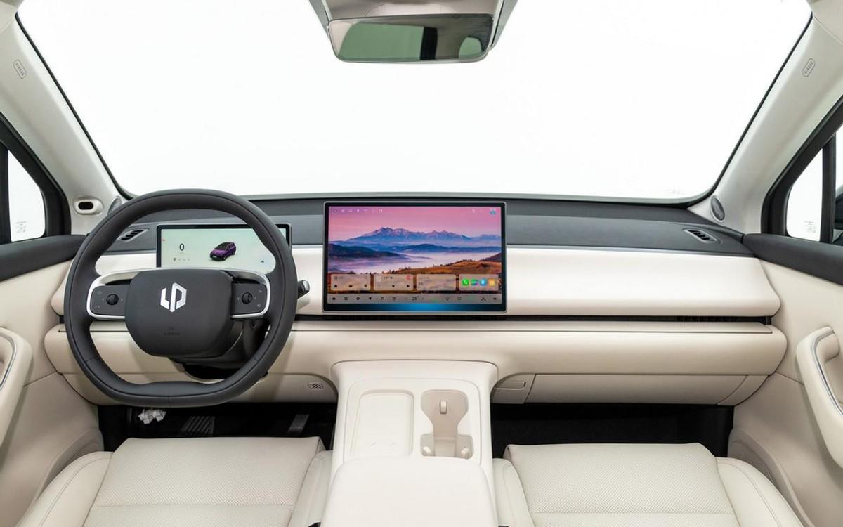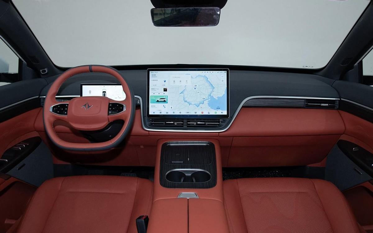 進入車內,eπ008的內飾設計很簡約,目之所及的地方我們能看到一塊懸浮式的儀表盤和一塊大尺寸的懸浮式中控屏,同時它還有著大量的皮革包裹,風格屬實也是和理想車型有那么一點相似的。