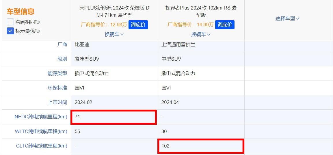 有意思的是,國產(chǎn)汽車品牌里的比亞迪宋PLUS DM-i,就在綜合續(xù)航里程方面花了更多的心思。例如它用了更省油的1.5L自然吸氣發(fā)動機,整車整備質(zhì)量也比探界者Plus要更輕,只有1770kg(探界者Plus是1860kg)。