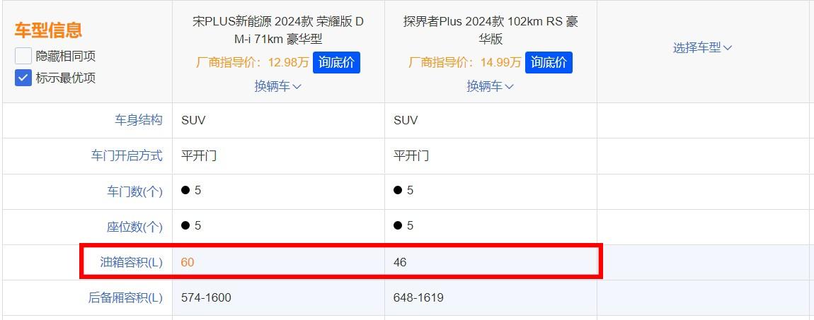 再有就是在油箱容積方面,宋PLUS DM-i的油箱容積達到了60L,這也是比探界者Plus的46L油箱容積要更大一些的。所以,這也就很好地解釋了為啥宋PLUS DM-i能做到真一千多公里的綜合續(xù)航里程,因為它確實在方方面面都做得很不錯,也印證了其插混SUV市場銷量冠軍的成色。