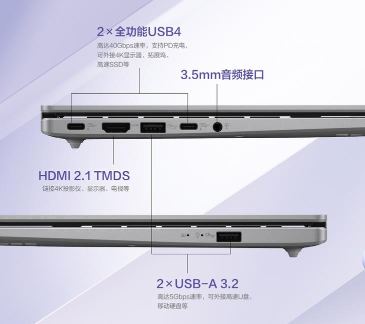 細節上,無畏14 AI版 2025同樣表現出色。外觀延續華碩無畏家族的潮流和輕薄屬性。全新機身設計,A面金屬+高光鉆切Logo,質感十足。機身輕約1.49Kg,薄至16.9mm,進一步提升輕薄度,滿足日常外出攜帶等需求。1080P+紅外攝像頭,支持Windows Hello人臉識別免密解鎖、背景虛化、人像居中、目光校正,暗光環境下亦能時刻保持隱私安全;屏幕采用14英寸16:10大視野護眼屏,178°可視角度,畫面沉浸感更強。接口則采用2×全能功能USB4 、2×USB-A 3.2、1×HDMI、1×3.5mm音頻插孔,設備擴展無憂,從容應對工作、生活各項挑戰。