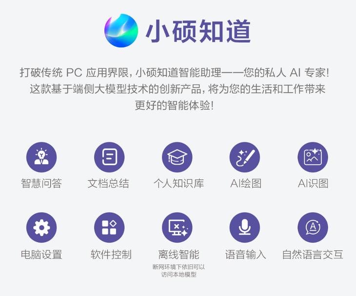 值得注意的是,全新無畏14 AI版 2025還內置了本地AI應用StoryCube一站式AI多媒體中心以及“小碩知道”AI助手。StoryCube支持不同人物、風景智能識別,可根據喜好快速整理分類大量照片、視頻和音頻,幫助用戶提升文件管理和多媒體文件處理效率;小碩知道則可化身您的個人專屬AI助手,提供離線問答、本地知識庫學習、疾速概括文檔內容、AI助手、一鍵喚醒應用、AI識圖、AI繪畫、連續AI對話等豐富功能,帶來前所未有的智能交互體驗
