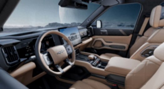 作為方程豹汽車的旗艦級硬派越野產品,新車的整個外觀基本延續了豹5的家族化設計,只是尺寸更大,而進入車內,橫平豎直的線條給人一種穩重大氣的感覺,不僅有大尺寸中控屏、液晶儀表,還有副駕駛屏幕,門板的裝飾也很特別。