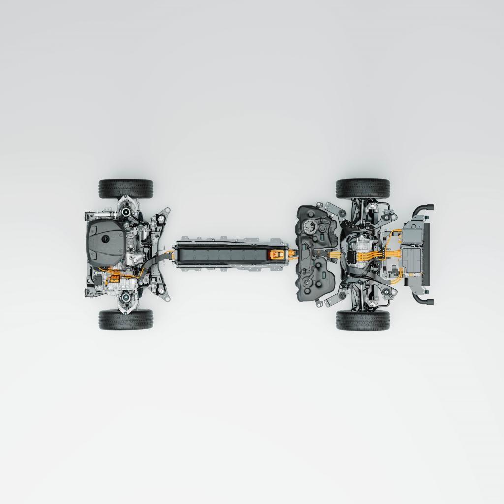 沃爾沃的空間解決方案相對巧妙。插電混動都是四驅。但不是靠增傳動機構實現四驅,而是在后輪位置增加一個電機。于是傳統四驅車布置傳動軸的中央通道就空出來了,電池包就放在這里。這樣布置也會提升電池安全,因為電池被底盤保護在正中央。