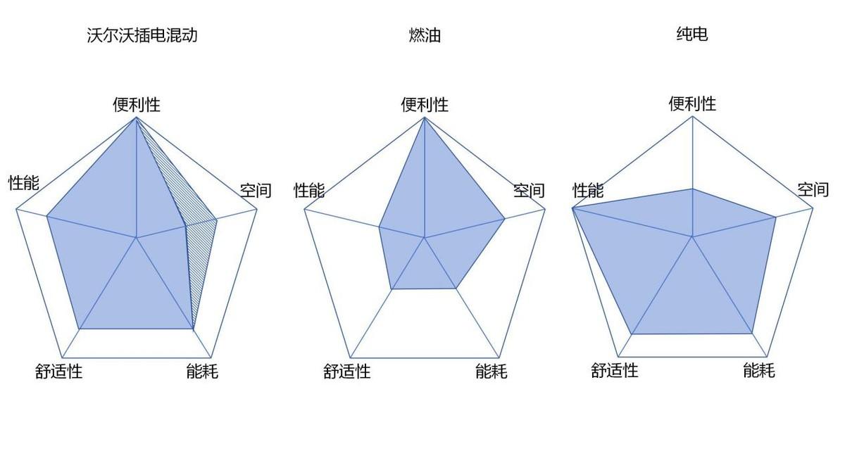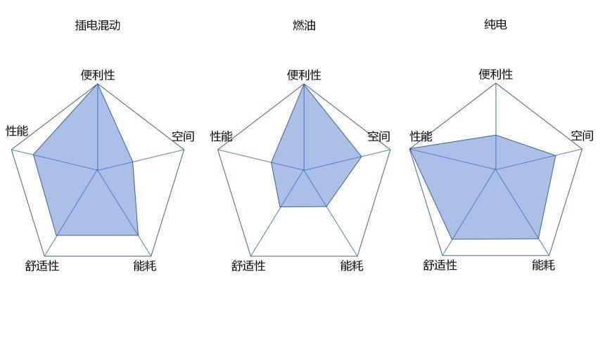 用五邊形圖展示插電混動、燃油、純電的特點。你會發現插電混動沒有格外突出的特點,但覆蓋面積最大。