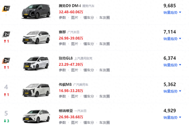 5月MPV銷量:騰勢D9第一,賽那/格瑞維亞合賣1.2萬多,GL8第三