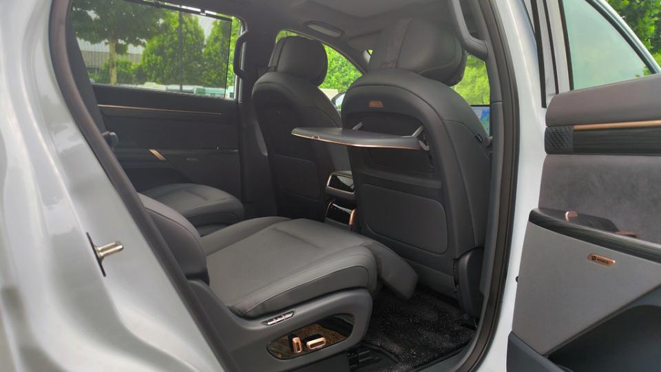 作為一輛家用SUV,eπ008也是將“彩電冰箱大沙發”給配齊了。二排兩個獨立座椅間是180mm的過道,方便進出三排座椅。二排右側零重力座椅不僅提供腿托和航空小桌板,還支持8點按摩、3檔通風加熱及一鍵躺平。二排座椅兩側還配備彈出式杯托和雙充電接口,遮陽簾相對于隱私玻璃也更實用。