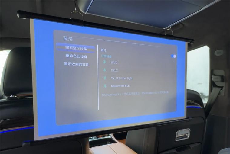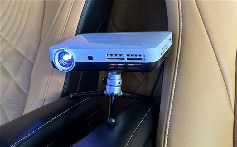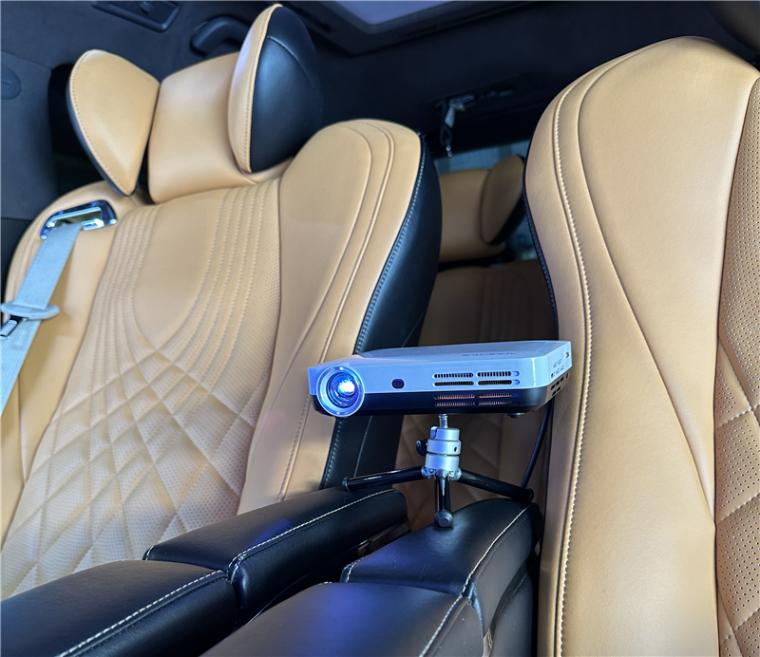 投影儀車主為了省事,直接用三角架擺放在座椅扶手處。當然如果你的車沒有M8這樣的扶手,那也可以懸掛吊裝在天花板,有各種安裝方式的工具,根據各自的車型來選擇。