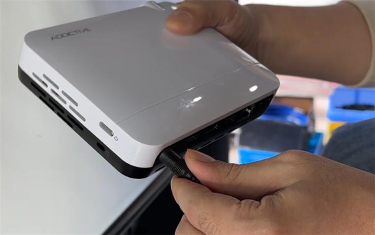 另一頭插入尖鋒投影儀的電源接口,再按開機按鈕就可以。