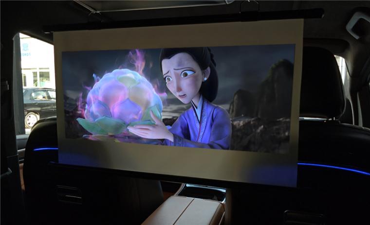 投影幕布用掛勾懸掛在前排座椅的后面,看完即收。