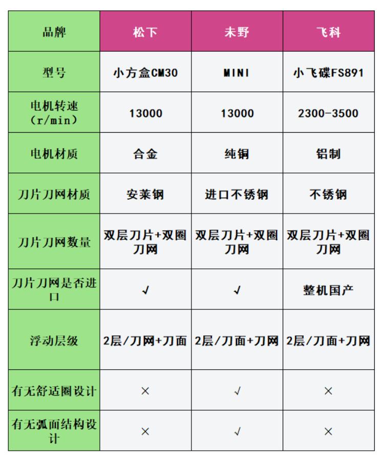未野、松下、飛科迷你mini剃須刀好不好用?怎么樣?我翻閱了諸多資料,整理出這三款產品的核心參數(如下圖),對于更加重要的參數我后續還會做進一步的介紹。