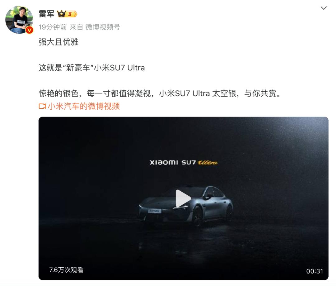 2月14日,@小米汽車官宣SU7 Ultra新配色“太空銀”并配文:“強大且優(yōu)雅,這就是‘新豪車’小米SU7 Ultra。驚艷的銀色,每一寸都值得凝視。”