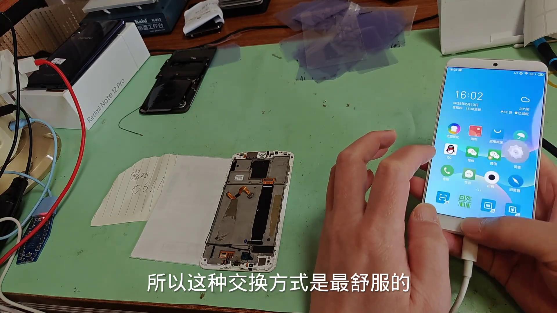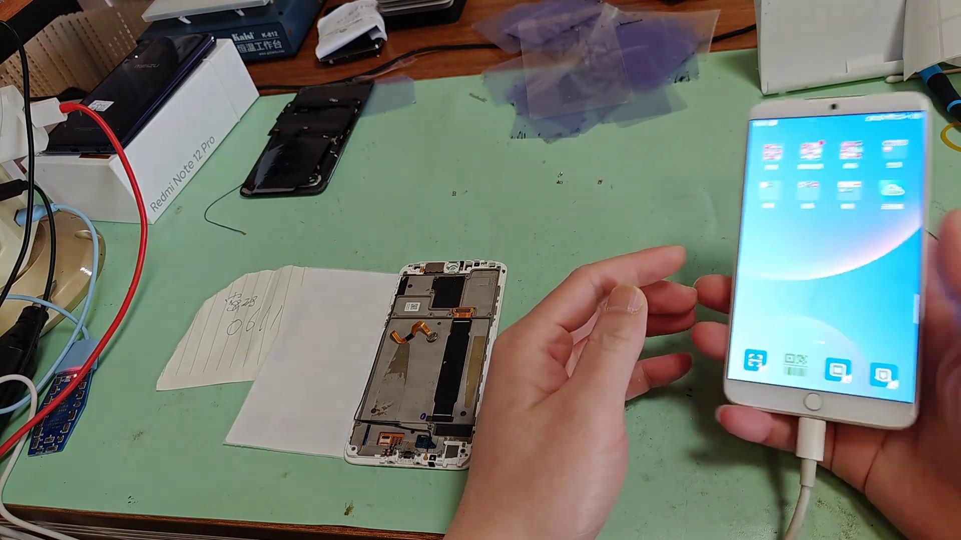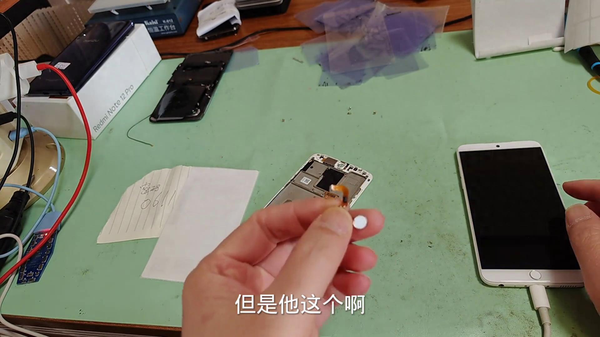 之前有很多同行自己換指紋也是不小心把這個通到排線上面,這個是液晶的排線,一頂它就壞掉了。這個是剛剛順豐發過來客戶急用,現在收到馬上已經換好了,來測一下手機的功能。
