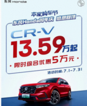 東風本田近期宣布啟動一項限時購車優惠活動,涉及旗下的兩款熱門車型:本田CR-V和本田思域。此次活動從7月1日開始,持續到7月31日結束,旨在為消費者提供購車優惠,最高可享達5萬元和3.5萬元的折扣。