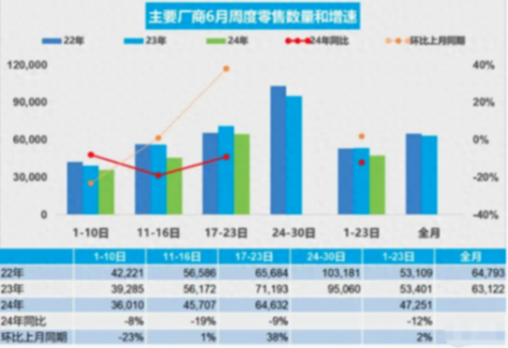 根據(jù)乘用車市場信息聯(lián)席會(乘聯(lián)會)近期發(fā)布的數(shù)據(jù),我們可以對6月份的乘用車市場進(jìn)行深入分析。從6月1日至23日的銷量數(shù)據(jù)來看,乘用車市場總零售量為108.7萬輛,相較去年同期下降了12%,但與上月同期相比,實現(xiàn)了2%的增長。進(jìn)一步觀察,2024年以來的累計零售量達(dá)到了916萬輛,同比增長了3%。
