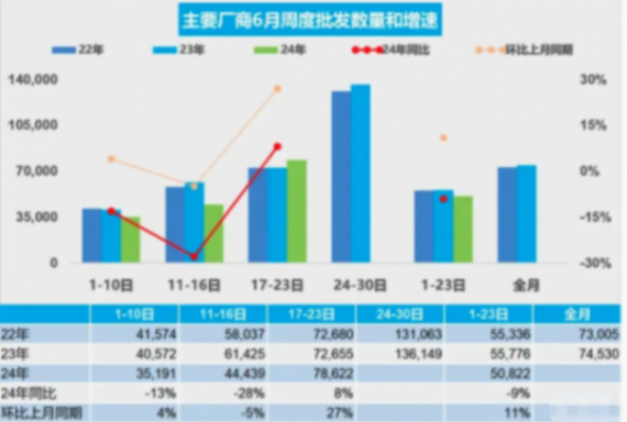 在乘用車廠商批發(fā)方面,6月第一周的日均批發(fā)量為3.5萬輛,同比下降了13%,但環(huán)比上月增長了4%。第二周這一數(shù)字為4.4萬輛,盡管同比下跌了28%,卻較上月下降了5%。值得注意的是,第三周的日均批發(fā)量大幅增長至7.9萬輛,同比增長了8%,環(huán)比上月增長了27%。