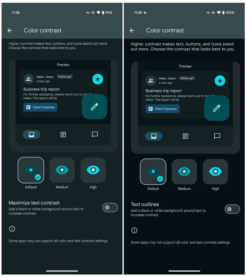 設(shè)置中的“最大化文本對(duì)比度”新增了“文本輪廓”選項(xiàng)。