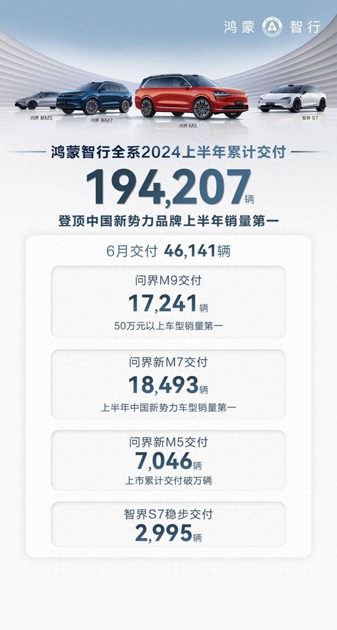 據官方數據顯示,鴻蒙智行6月交付46141輛,2024年累計交付194207輛,登頂中國新勢力品牌上半年銷量第一。其中,豪華科技旗艦SUV問界M9,6月交付17241輛,累計大定超10萬輛;國民SUV問界新M7,6月交付18493輛,穩居2024年上半年中國新勢力車型第一;高顏都市性能SUV問界新M5 6月交付新車7046輛,累計交付超1萬輛;鴻蒙智行首款智慧轎車智界S7,6月交付新車2995輛。