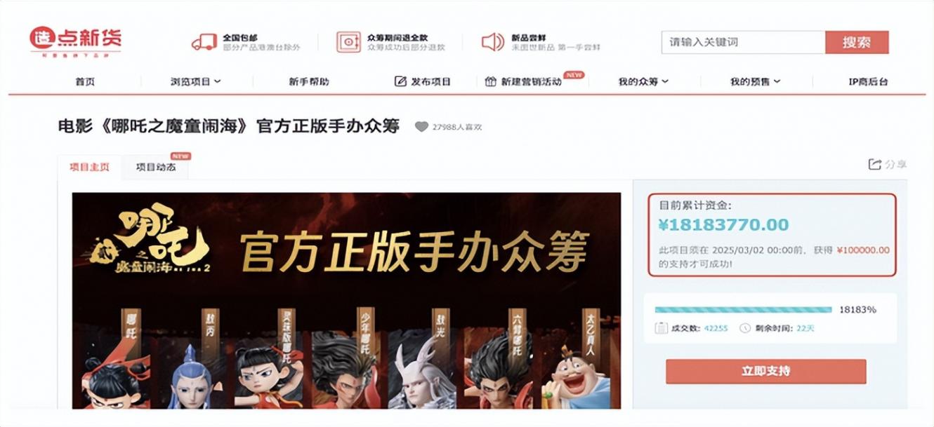 除了盲盒外,其他周邊商品也表現(xiàn)不俗。獲得官方授權的卡游官方旗艦店、集卡社旗艦店推出的《哪吒之魔童鬧海》周邊卡牌同樣受到消費者的熱烈追捧。僅一周時間,相關卡牌便賣出超過70萬張,累計成交額突破百萬元。其中,卡游限量發(fā)售的餃子導演親筆簽名卡更是成為眾多粉絲心中的“圣物”。此外,淘寶平臺上還涌現(xiàn)出眾多由粉絲自發(fā)發(fā)起的周邊眾籌項目。例如,F(xiàn)unCrazy塑料主義、阿里魚旗下品牌“造點新貨”等商家發(fā)起的《哪吒2》周邊眾籌項目,目標籌款10萬元,但目前在淘寶上已經眾籌到了超過1800萬元。這一數(shù)字不僅超出了預期目標,也進一步證明了哪吒IP的商業(yè)價值。