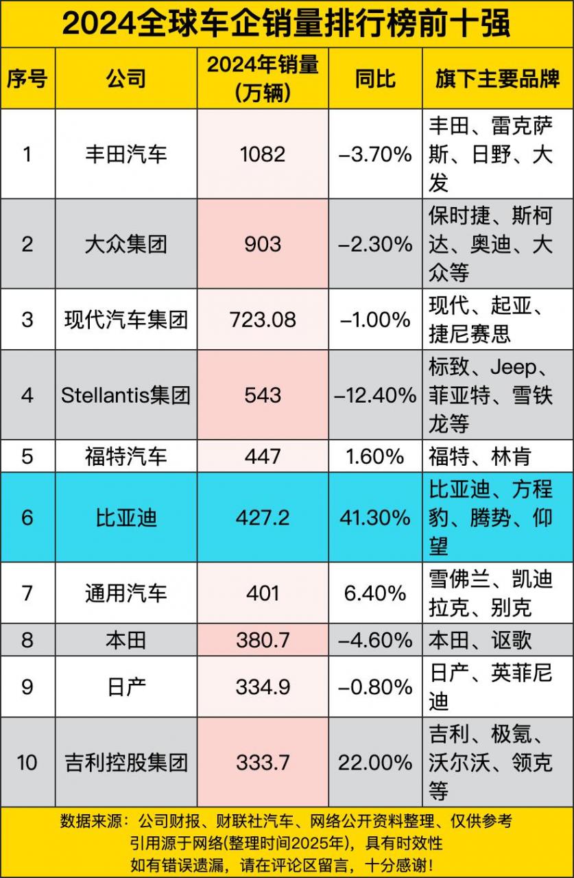 2024全球車企銷量排行榜前十強,豐田居首,比亞迪增速亮眼