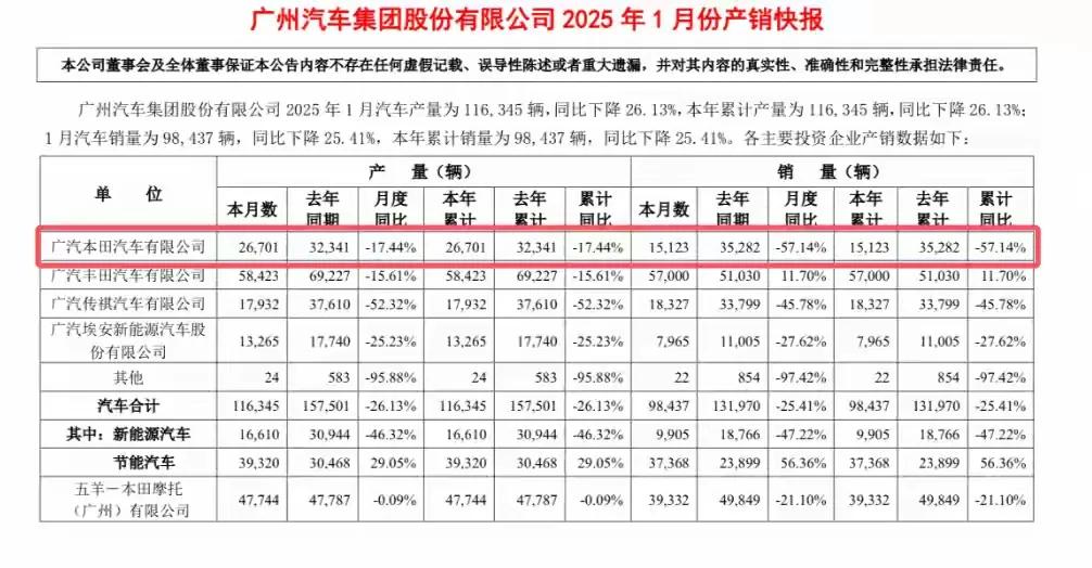 剛剛過去的2025年一月份,本田公布了一月份銷量情況。1月份本田的銷量頹勢仍未止住,1月僅賣出了6.8萬輛新車,同比跌了30%,其中廣汽本田的銷量更是直接腰斬至1.5萬輛,同比下滑57%。