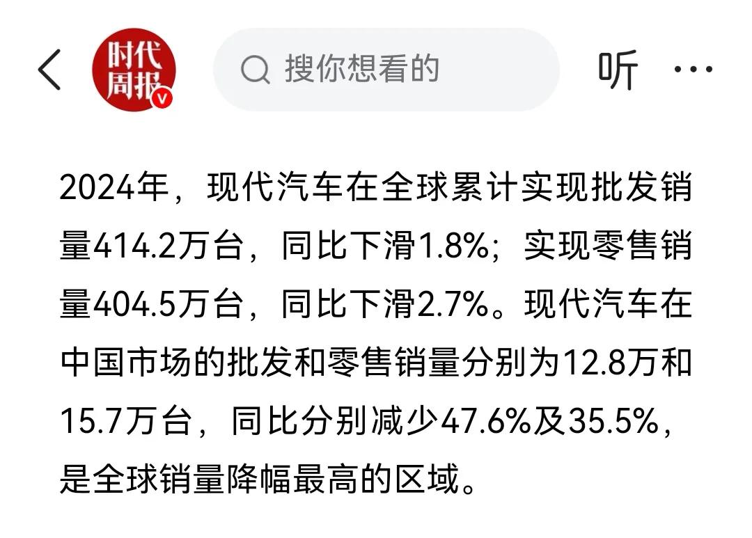 我們且不說現代和起亞是兩個獨立運營的品牌,現代只是擁有起亞34%的股份,就算是現代想要助推起亞反攻中國市場,現代自己一年的銷量也才414.2萬輛,能拿出多大的力量來支持起亞反攻中國市場,有那個實力還不如幫助現代自己擴大中國市場。2024年現代自己在中國的銷量下跌了47.6%。