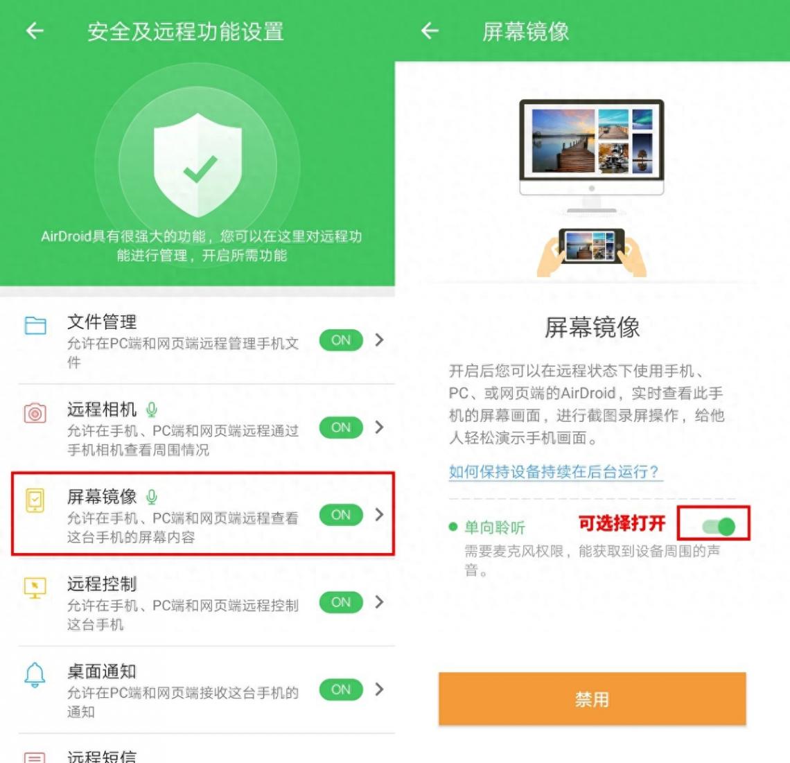 然后,在華為手機安裝AirDroid,注冊并登錄賬號。點擊【個人】【安全及遠程功能設置】,打開【屏幕鏡像】開關(guān),開啟相關(guān)權(quán)限。無需打開單項聆聽。